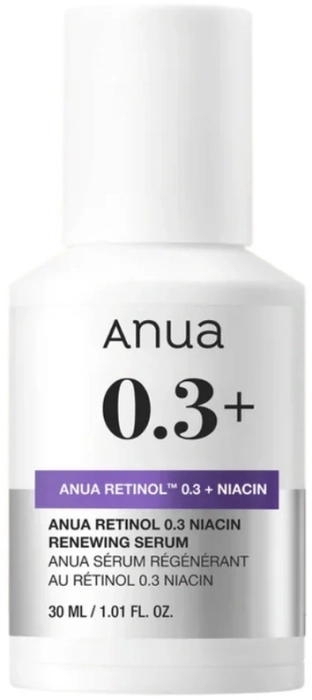 Anua Retinol 0.3% + Niacin Renewing Serum es un suero avanzado diseñado para mejorar la pigmentación, elasticidad, poros y textura de la piel. Combina nano retinol con niacinamida para ofrecer beneficios antienvejecimiento e iluminadores. La fórmula utiliza tecnología de liposomas para encapsular los ingredientes activos, asegurando una absorción efectiva en la piel.